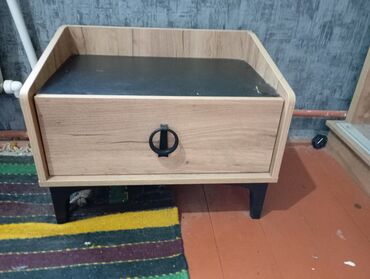 - Tumba (yataq yanı stol): 1 böyük çekmece, qara üst səth, hündür ayaqlar.