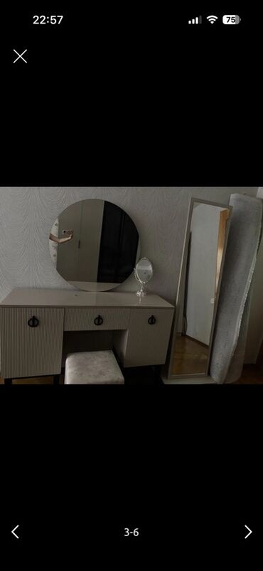 - Makiyaj/işıqlandırmalı konsol: üstü parlaq krem səthli, yanlarda relyefli panellər. Üç çekmece (iki yan, bir mərkəz) və ortada oturacaq üçün boşluq. Qara halqavari tutacaqlar.