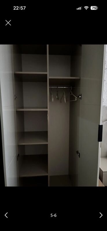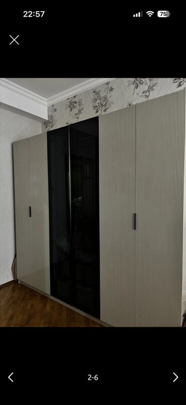 - 4 qapılı iri şkaf: iki tərəf şaquli relyefli açıq krem panellərlə, orta hissə tutqun qara şüşə panellidir. Sadə qara tutacaqlar, düz xətlər, müasir minimal dizayn. Geniş saxlama imkanı üçün bölmələr və rəflərlə uyğun konstruksiya.