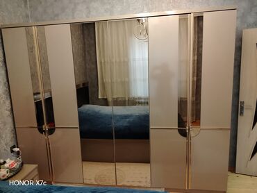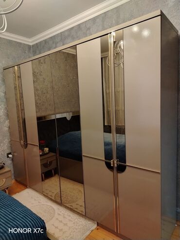Yataq otağı mebel dəsti Tərkib: - 6 qapılı böyük şkaf: krem rəngli fasadlar, qızılı haşiyələr və dekorativ dairəvi qızılı tutacaqlar; 2 ədəd tam ölçülü güzgü qapı; modullu bölmələr üçün geniş saxl...