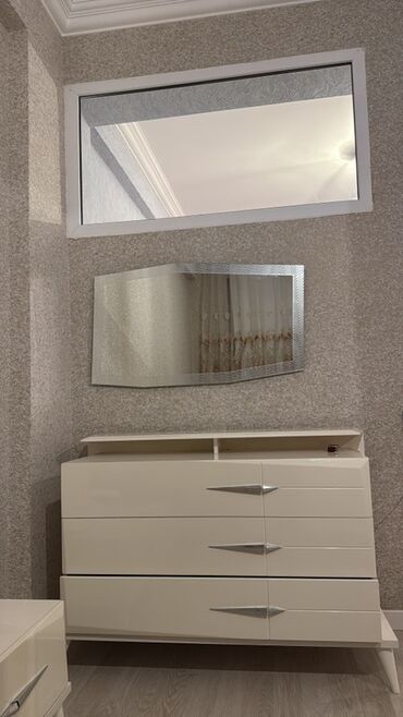 • Komod – 3 iri çəkməcə, üstündə açıq rəf hissəsi; divara asılan dekorativ güzgü ilə.