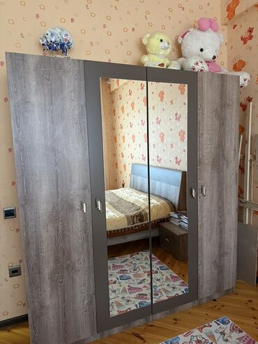 - 4 qapılı şkaf – ortada 2 ədəd böyük güzgü qapı, hər iki tərəfdə asılqan və rəf bölmələri