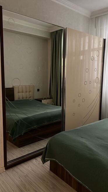 Yataq otağı mebel dəsti - Çarpayı: yumşaq süngərlə işlənmiş düyməli başlıq, neytral açıq rəngli örtüklə uyğunlaşan dizayn. İki nəfərlik ölçüdə. - Şkaf: sürgülü qapılar, bir qapıda iri boy güzgü, d...