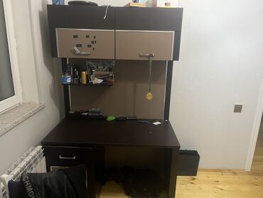 - 1 ədəd yazı masası üst dolablı – geniş iş səthi, solda qapılı bölmə, yuxarıda 2 qapalı şkaf və açıq rəf.
