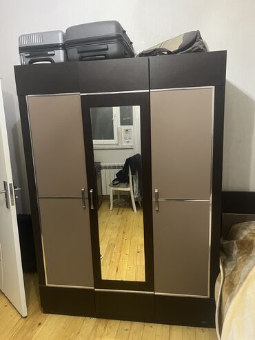 - 1 ədəd 3 qapılı dolab – ortada böyük güzgülü qapı, yanlarda bej panellər, metal tutacaqlar.