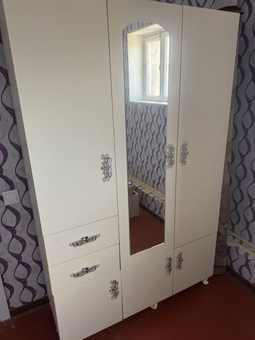 • Güzgülü qarderob – mərkəzdə tam boy güzgü, sağ-sol qapılar, aşağıda əlavə bölmələr; solda 3 çekmece və alt bölmə; dekorativ metal tutacaqlar, dayanıqlı ayaqlar.