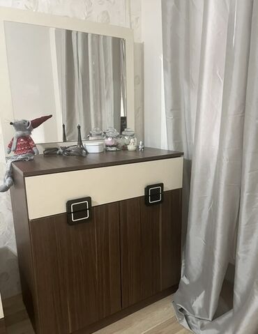 - Komod: Üst güzgülü konsol tipli komod. Üst səth gündəlik aksesuarlar üçün rahatdır; aşağı hissə iki qapılı saxlama bölməsi ilə.