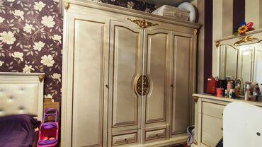 Yataq otağı mebel dəsti - Klassik dizaynlı dəst: krem rəngdə, qızılı dekor elementləri ilə. - Geniş 4 qapılı şkaf: mərkəzdə naxışlı ornament, alt hissədə 2 çekmece; asılqan və rəf bölmələri üçün n...