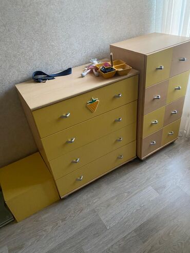 - Uşaq/yeniyetmə otağı üçün komodlar – biri 4 çekmecəli enli model, digəri 6 kiçik bölməli dar model; alüminium tutacaqlar.