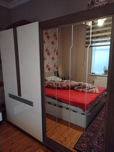 - Geniş sürgülü şkaf: bir qapısı boydan‑boğa güzgülü, digər qapısı ağ rəngdə dekor panellərlə. Daxili hissədə asılqan bölmələri və rəflər üçün uyğun quruluş.