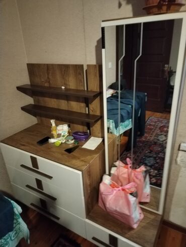- Komod və güzgülü tualet masası: 3 geniş çekmece, üst hissədə açıq rəflər və yan hissədə iri güzgü. Üst panel və yan elementlər ağac teksturalıdır.