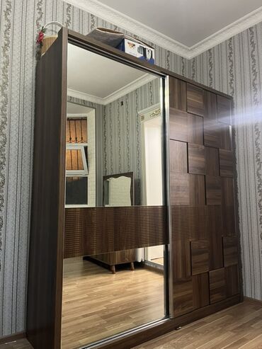 - Sürgülü qapılı paltar şkafı: 2 qapı, biri tam boy güzgülü. Daxili planlama iki bölmədən ibarətdir: bir tərəfdə geyim üçün asılqan çubuğu və yuxarı rəf, digər tərəfdə çoxsaylı rəflər. Alüminium rels sistemi, ağac teksturasında dekorativ panellər və horizontal rellef zolaqları ilə modern dizayn.
