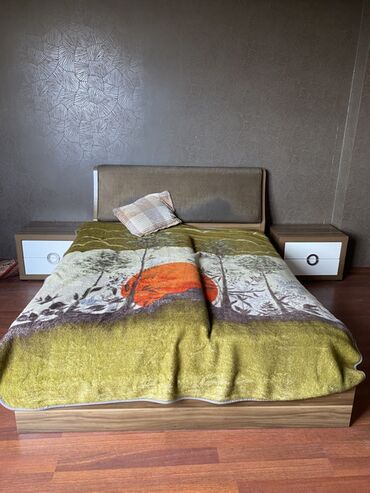 - 1 ədəd iki nəfərlik çarpayı: taxta teksturalı baza, yumşaq başlıq (qəhvəyi tonlarda).
