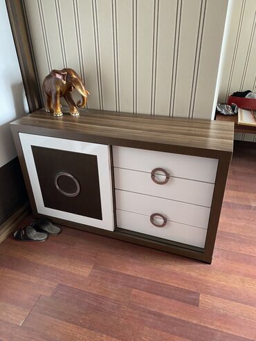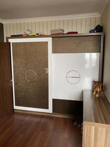 - 1 ədəd iri sürgülü qapılı şkaf: iki rəngli (qəhvəyi və ağ), dairəvi dekor dəstləri, yuxarıda geniş rəf zonası.