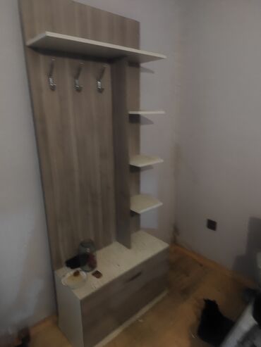 - Dəhliz askısı/komod: üst rəf, 3 ədəd metal paltar asqısı, sağ tərəfdə pilləli açıq rəflər, aşağıda qapalı bölmə/oturacaqlı sandıq tipli hissə.