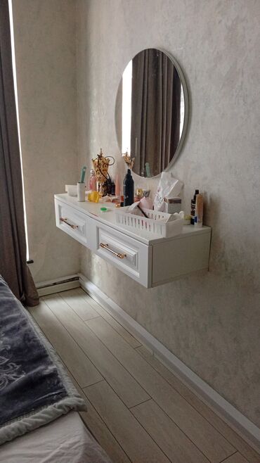 - Asma makiyaj masası: divara montajlı konstruksiya, 2 dərin çekmece, dekorativ qızılı tutacaqlar. Kompakt məkanlarda yerə qənaət edir.