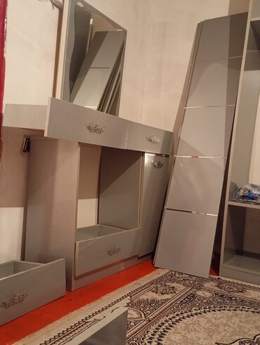 - Tuvalet masası (pufiksiz): böyük güzgü, yan və alt çekmecələr, zərif tutacaqlar.
