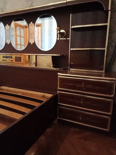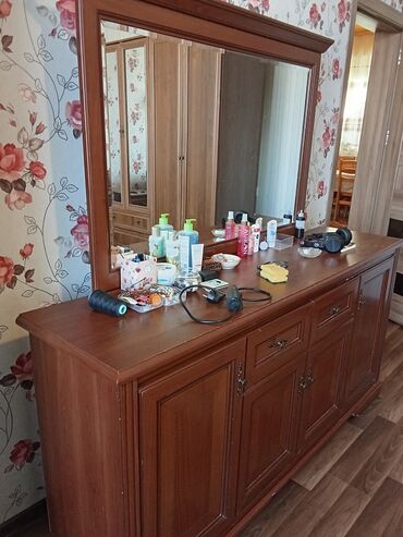 - Komod + iri divar güzgüsü: hər iki tərəfdə qapalı bölmə, ortada bir neçə çekmece