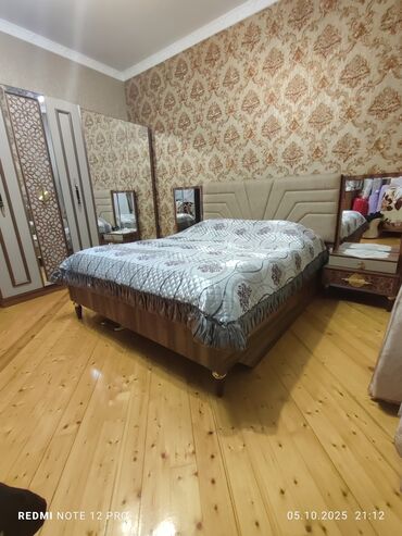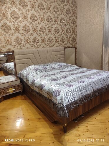 - Geniş çarpayı (yumşaq başlıq, taxta karkas, qəhvəyi ağac teksturası)