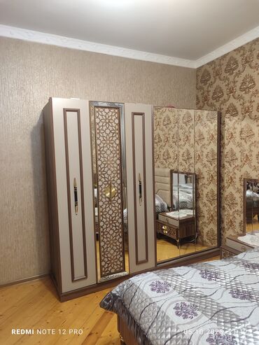 - 3 qapılı qarderob (orta hissədə dekorativ oyma panel və güzgü elementləri, qızılı tutacaqlar)