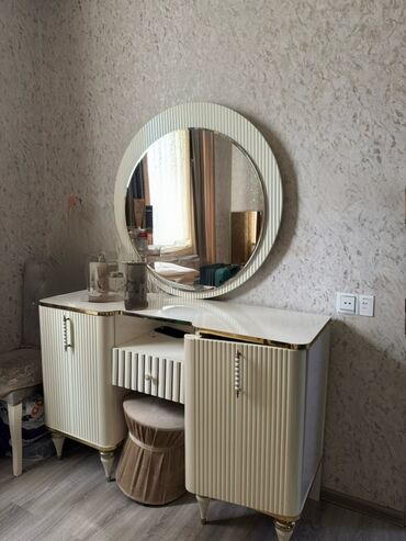 - Tualet masası və oturacaq: böyük dairəvi güzgü, mərmər effekti üst səth, mərkəzdə çekmece, iki tərəfdə qapalı dolab bölmələri, relyefli fasad və qızılı dekor. Yumşaq taburet daxildir.