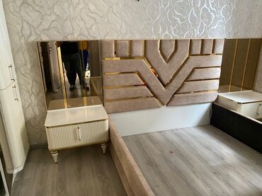 Yataq otağı mebel dəsti - Yataq: Yumşaq başlıqlı, bej rəngli parça ilə üzlənmiş, başlıqda qızılı dekor elementləri. İki tərəfdə uyğun tərzdə tumbalar – üstü tünd rəng panel, qızılı haşiyələr və ha...