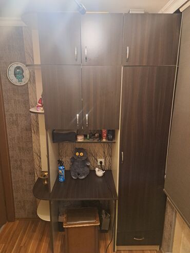- Şkaf–stol kombini: yuxarı hissədə iki qapılı dolab bölmələri, sağda ayrıca hündür dolab və aşağıda çekmece; ortada açıq rəflər; inteqrə olunmuş iş masası. Masa üstü və fasadlar tünd ağac rəngində, tutacaqlar metal.