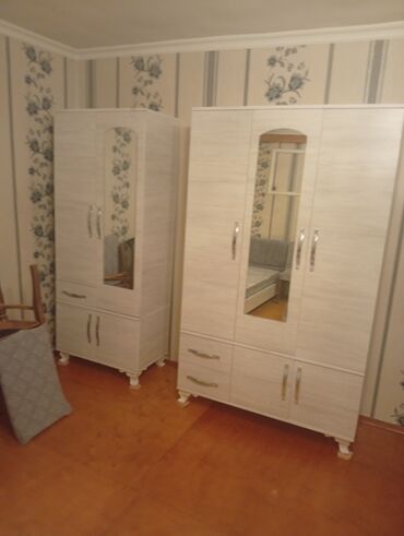 - 2 ədəd qapılı paltar dolabı – eyni seriya, ağ-açıq palıd rəngində. Hər iki dolabda ön hissədə güzgü, yanlarda asılqan bölmələri, aşağı hissədə çəkmeçələr, dekorativ ayaqlar və metal tutacaqlar var.