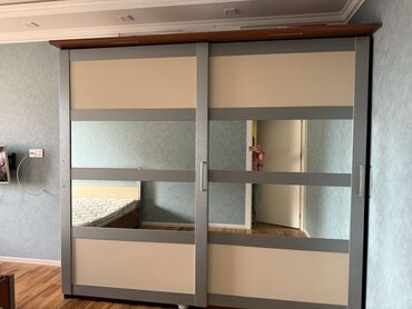 - Güzgülü kupe şkaf: iki sürgülü qapı, geniş panoramik güzgü panelləri, boz/alüminium rəngli profillər, krem panellər və üst taxta rəf. Daxildə asılqan və rəflər üçün nəzərdə tutulan geniş saxlama sahəsi.