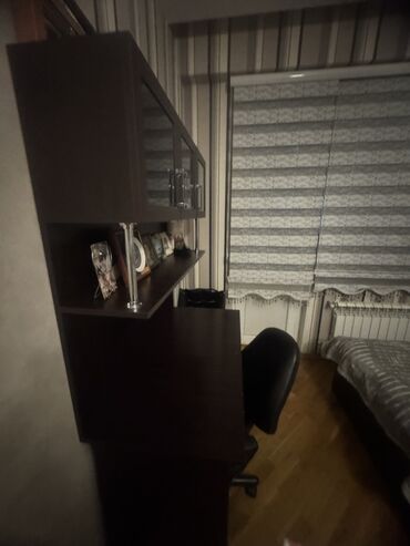 - Masa bloku: geniş iş səthi, üst hissədə şüşəli dolablar və əlavə açıq rəflər – kitab, sənəd və dekor üçün uyğundur.