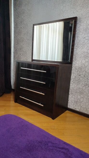 - Güzgülü komod: 4 geniş çekmece, uzun metal tutacaqlar, üstündə böyük çərçivəli güzgü. Korpus tünd qəhvəyi, ön panellər parlaq qara.