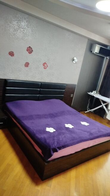 - 2 nəfərlik geniş çarpayı: yüksək başlıq, yumşaq dəri/eko-dəri panel, tünd ağac teksturalı karkas. Yanında inteqrə edilmiş tumba.