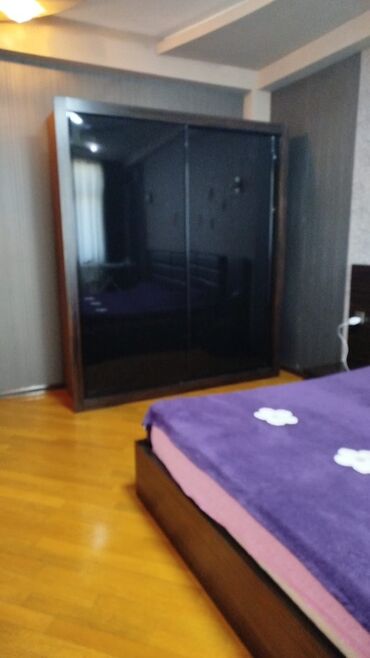 - Sürgülü qapılı qarderob: iri ölçülü, parlaq qara ön hissə, tünd ağac çərçivə.