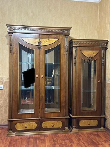 Klassik üslubda taxta mebel dəsti • Yataq otağı komplekti: - İri 4 qapılı şkaf: mərkəzdə tam boy güzgülü qapılar, kənarlarda taxta panellər; zəngin oyma naxışlar, relyefli üst taç, lökərcə ayaql...