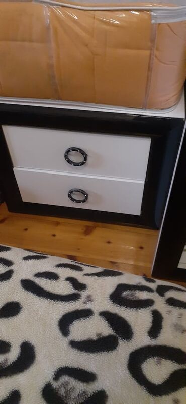 - Tumba: 2 çekmecəli, ağ ön panellər və qara çərçivə, dairəvi dekorativ tutacaqlar.