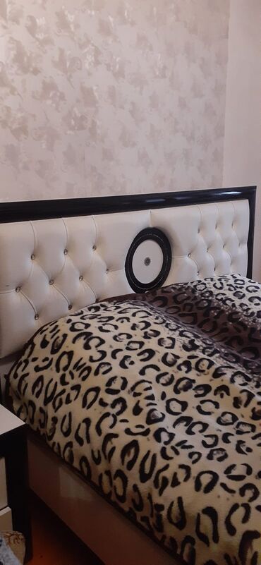 - İkinefərlik çarpayı: Ağ rəngli, başlıq hissəsi düyməli (kapitonaj) dizaynla, qara parlaq çərçivə ilə tamamlanıb. Başlığın mərkəzində dekorativ dairəvi element var.