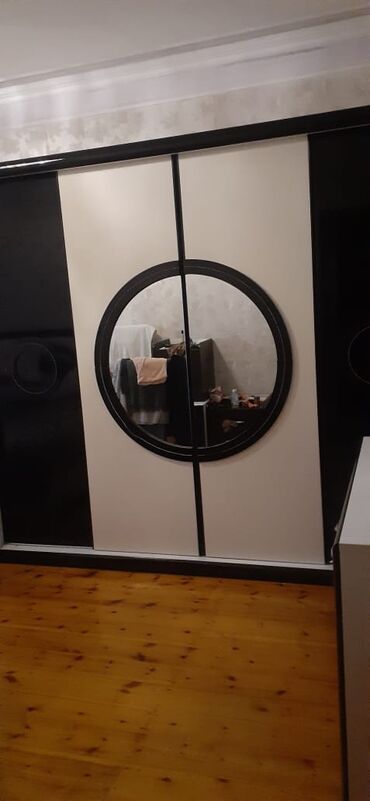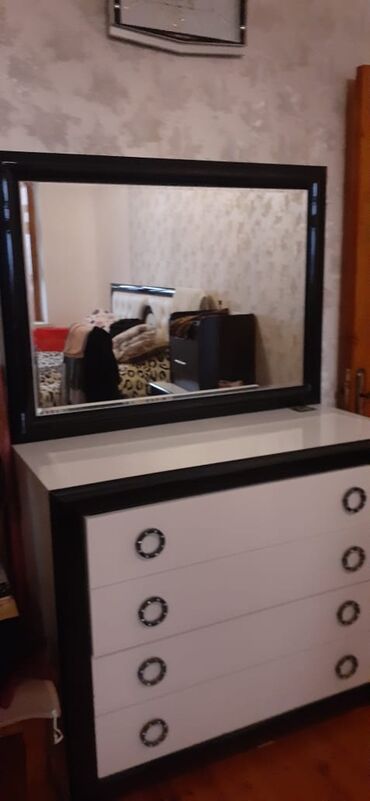 - Komod güzgü ilə: 4 çekmecəli böyük komod, üstündə geniş güzgü. Ağ ön panellər, qara çərçivə və dairəvi tutacaqlar dizaynı ilə bütöv dəst kimi uyğundur.