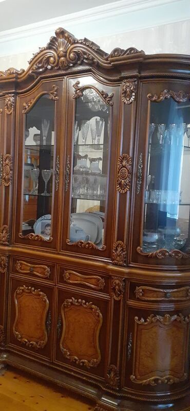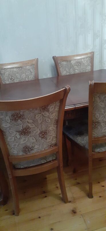 - masa və 6 ədəd stul: Təbii ağac rəngində masa, klassik oyma detallı baza. Stulların arxa hissəsi və oturacaqları çiçək naxışlı parça ilə üzlənib, taxta karkaslıdır.