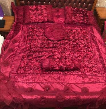 Qırmızı dekorativ yataq dəsti/Yeni - Dizayn: Dərin qırmızı rəngdə, iri 3D gül naxışlı və qat-qat plissé büzməli tekstura. - Tam dəst: 1 ədəd Yataq örtüyü,2 ədəd Yastıqüzü, 2 ədĕd Yan pərədə - Ölç...