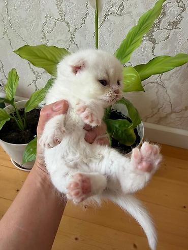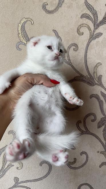 Scottish Fold balası – sevimli və çox nadir heteroxrom gözlü (bir göy, bir qara-qəhvəyi) ağ rəngli kürk. Xüsusiyyətlər: - Qıvrıq (yatıq) qulaqlar, yumşaq və sıx tük örtüyü - Dəyirmi üz, qısa bur...