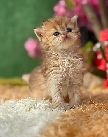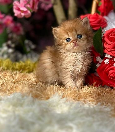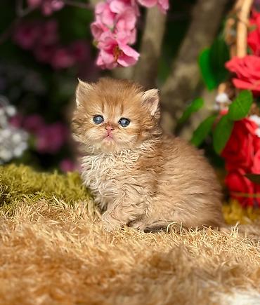 Balaca pişik balası – uzun tüklü, zəncirvari dalğalı kürk, qızılı/zəncəfili rəng çalarları, sinə və üz nahiyəsində açıq krem xəttləri. Böyük yuvarlaq mavi gözlər, qısa burun, kiçik üçbucaq qulaqlar. Kompakt bədən quruluşu, sıx quyruq. Sakit və mehriban xarakterə uyğun görünür, ev şəraitində ailələrlə yaxşı uyğunlaşa biləcək tipdədir.