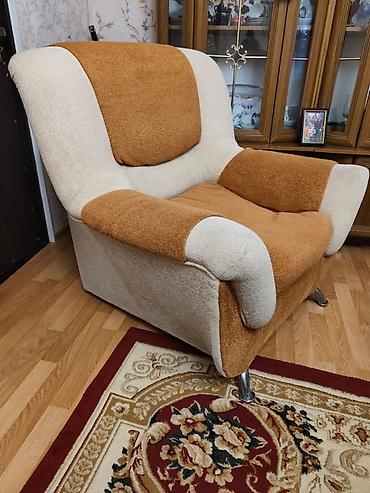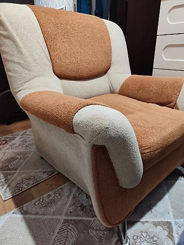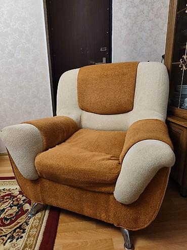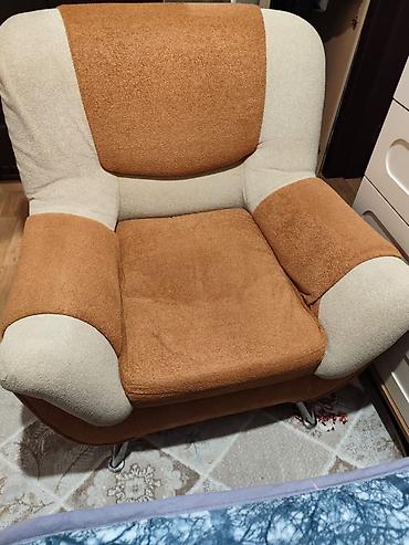 Tək nəfərlik 2 ədəd yumşaq kreslo 100 Azn. - Rəng: bej/qəhvəyi tonlarda - Material: yumşaq toxumalı parça, yanlarda dekorativ dəri elementləri - Dizayn: eni geniş oturacaq, həcmi böyük kürək hissə...