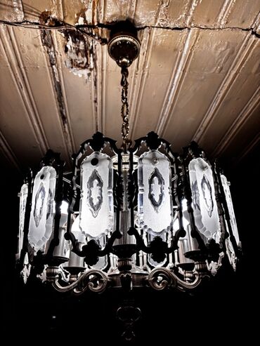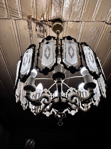 Şüşə-kristal tavan lampası (plasfon) - Forma: dairəvi, yarı-qapalı tavan tipli - Material: parlaq xrom rəngli korpus, kəsimli kristal elementlər və şüşə bəzəklər - Dizayn: ağ fon üzərində qızılı ç...