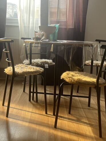 - Masa: dairəvi üst səth, üzərində şəffaf qoruyucu örtük; möhkəm metal ayaqlar, stabil karkas
