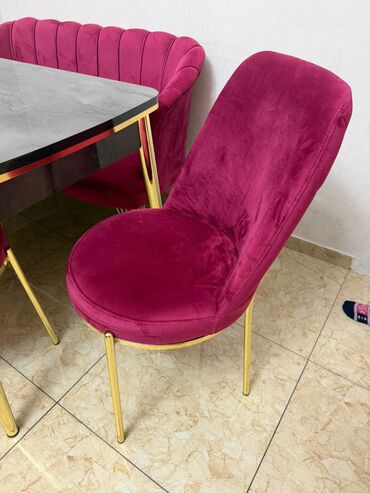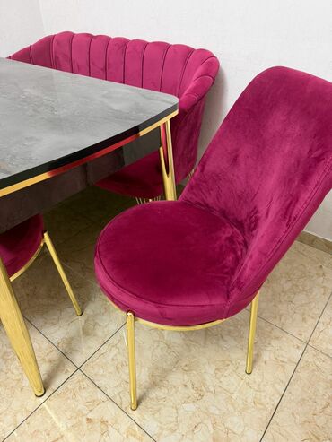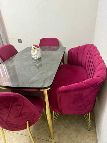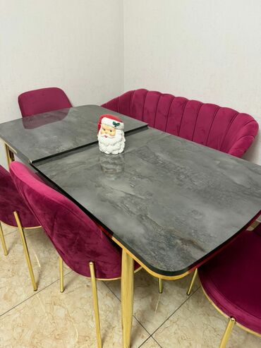 Mətbəx/qonaq otağı üçün şık yemək dəsti - Komplekt: düzbucaqlı masa + 1 divan tipli künc oturacaq + 3 stul - Masa üstü: boz mərmər effektli parlaq səth, yumşaq yuvarlaq künclər, qara-qızılı kənar ...