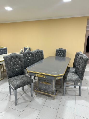 - 6 ədəd yumşaq, kapitone işləməli stul, bel hissəsində dekorativ düymələr, üst hissədə qızılı naxış