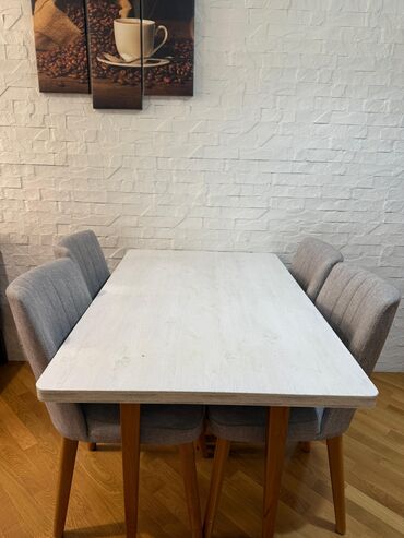 Modern yemək dəsti – 1 masa + 4 oturacaq - Masa: düzbucaqlı forma, taxta teksturalı üst səth; dekorativ “Z” formalı qara metal ayaqlar. Səth rahatlıqla silinir, gündəlik istifadə üçün praktikdir. ...