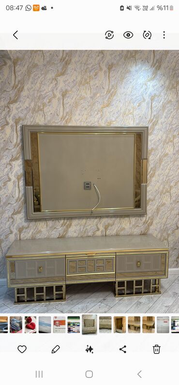 - TV stend: dəstlə eyni dizayn xətti; qızılı çərçivələr, güzgü panellər, çekmecələr və yan şkaf qapıları; üst panel geniş