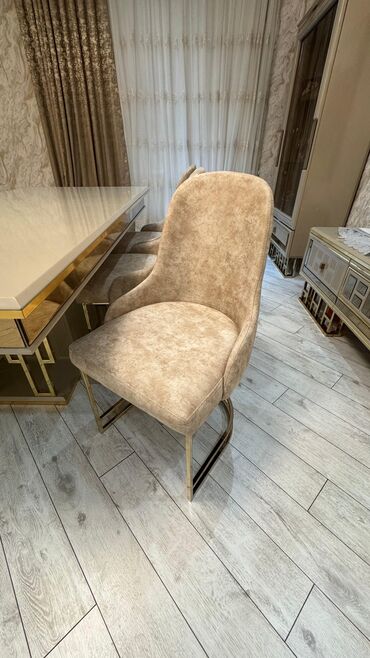 - Stullar: yumşaq üzlüklü (bej nubuk/şamoa effektli parça), bel dəstəyi komfortlu, qızılı rəngli metal karkas və relsvari ayaqlar