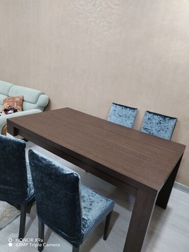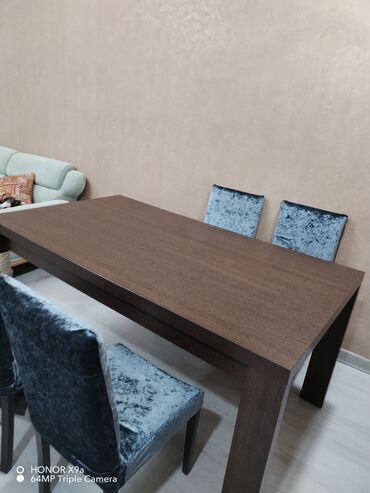- Rəng uyğunluğu: masa – tünd qəhvəyi; stullar – boz-mavi məxmər toxumalı üzlük, tünd ayaqlar